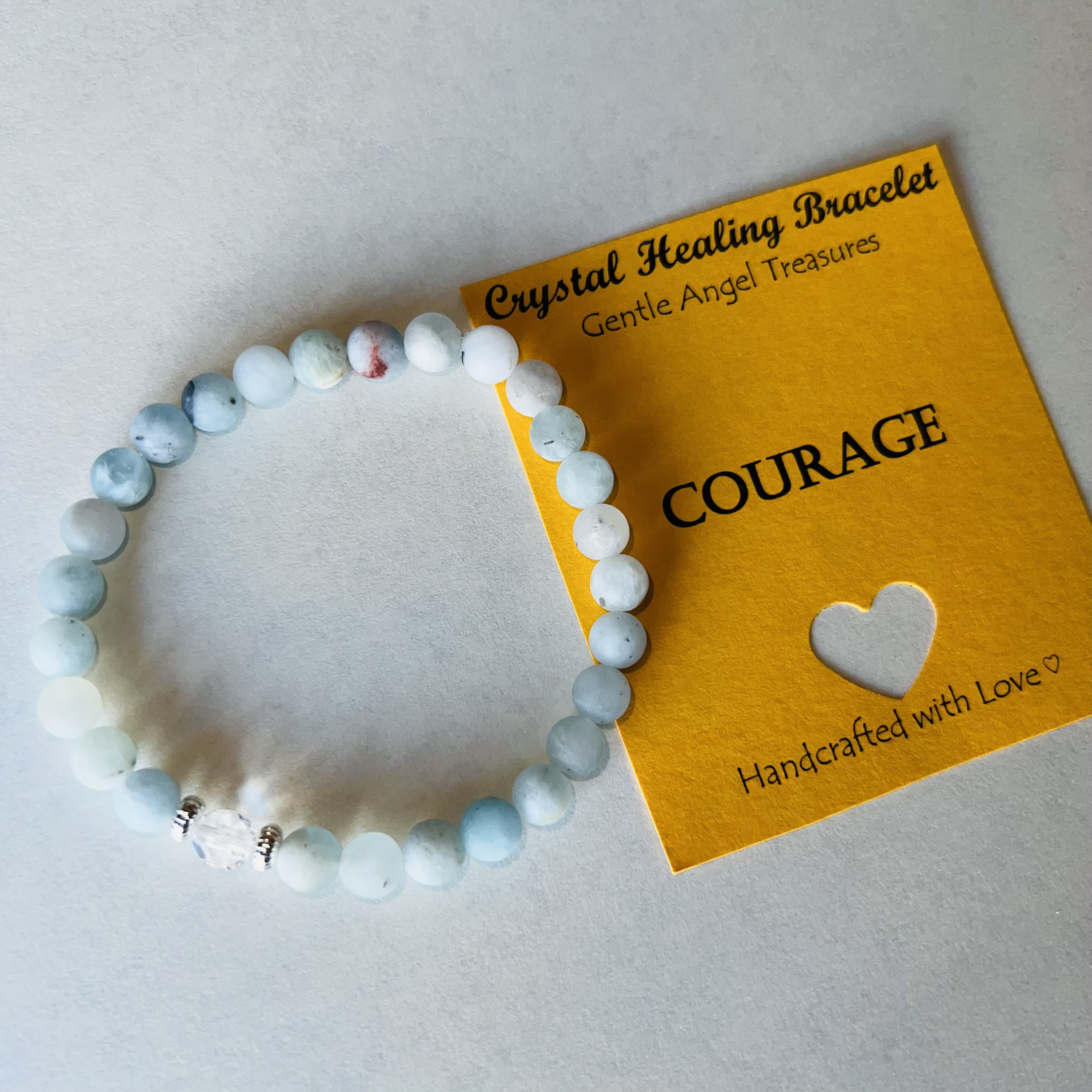 Aquamarine (blue to blue-green variety of Beryl): Known to help build up courage. Brings calm, compassion, and spiritual awareness.